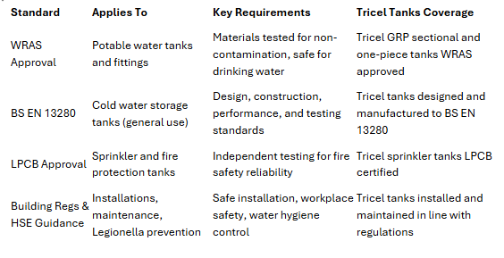 Alongside WRAS, BS EN 13280, and LPCB, tanks may also be subject to requirements under the Building Regulations and Health & Safety Executive (HSE) guidance. These cover areas such as installation standards, workplace safety during maintenance, and Legionella control in cold water systems.
